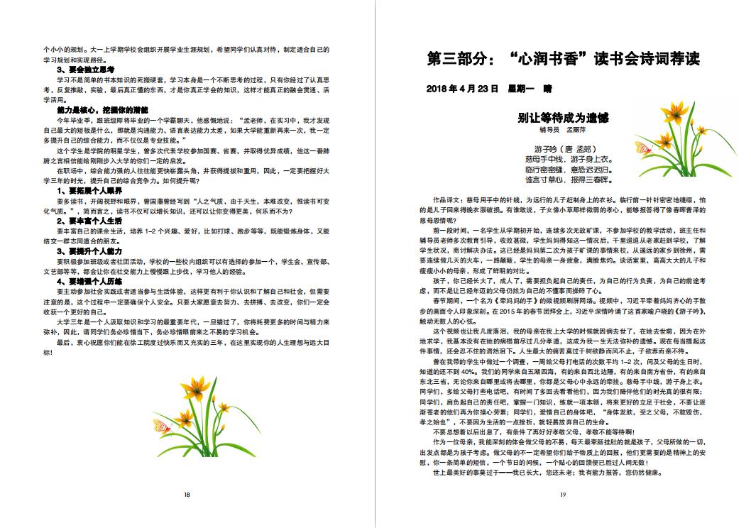 第三部“诗词荐读”是推出的一个新版块,邀请学院老师结合学生情况,推荐诗词,并撰写文章,在潜移默化中提升学生的人文素养和道德情操。这里面既有引导学生树立感恩意识的《游子吟》——别让等待成为遗憾,又有引导广大青年理性爱国的《满江红》——爱国底线不容挑战;既有引导学生诚信于人,诚信于心的《咏史四首》——树诚信之风,扬诚信之气,又有引导学生要珍惜时光,立志成才的《劝学》——将来的你一定会感激现在拼命的自己,每期内容都是老师们精心准备的一道精神大餐,让青年学子们从中国传统文化中汲取向上的力量。