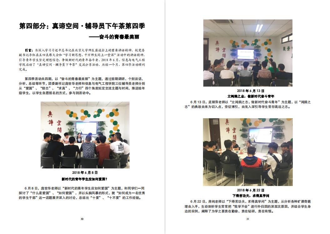 第四部分“辅导员下午茶”,以“奋斗的青春最美丽”为主题,通过前期调研、个别谈话、分析总结等环节,团委副书记庞世华老师和三位辅导员老师分别从爱国、励志、求真、力行四个角度拟定交流主题和时间,引导学生志存高远,勤勉致知,并在实践中不断的提升自我、完善自我。