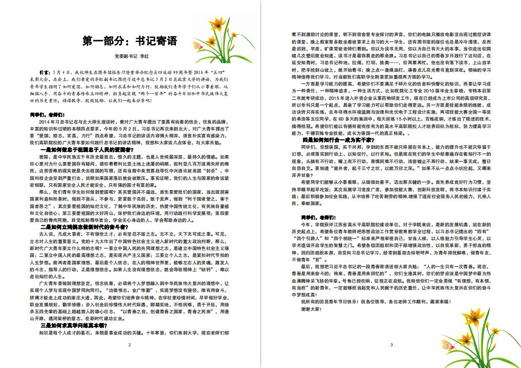第一部分“书记寄语”中,收录了党委副书记李红老师在2018年“五四”表彰大会上的讲话内容,李书记围绕习近平总书记5月2日在北京大学的讲话,为青年学生指明了如何爱国、如何励志、如何求真和如何力行,鼓励青年学子用奋斗的青春传承五四精神,担负起实现“两个一百年”的奋斗目标和中华民族伟大复兴的历史重任。