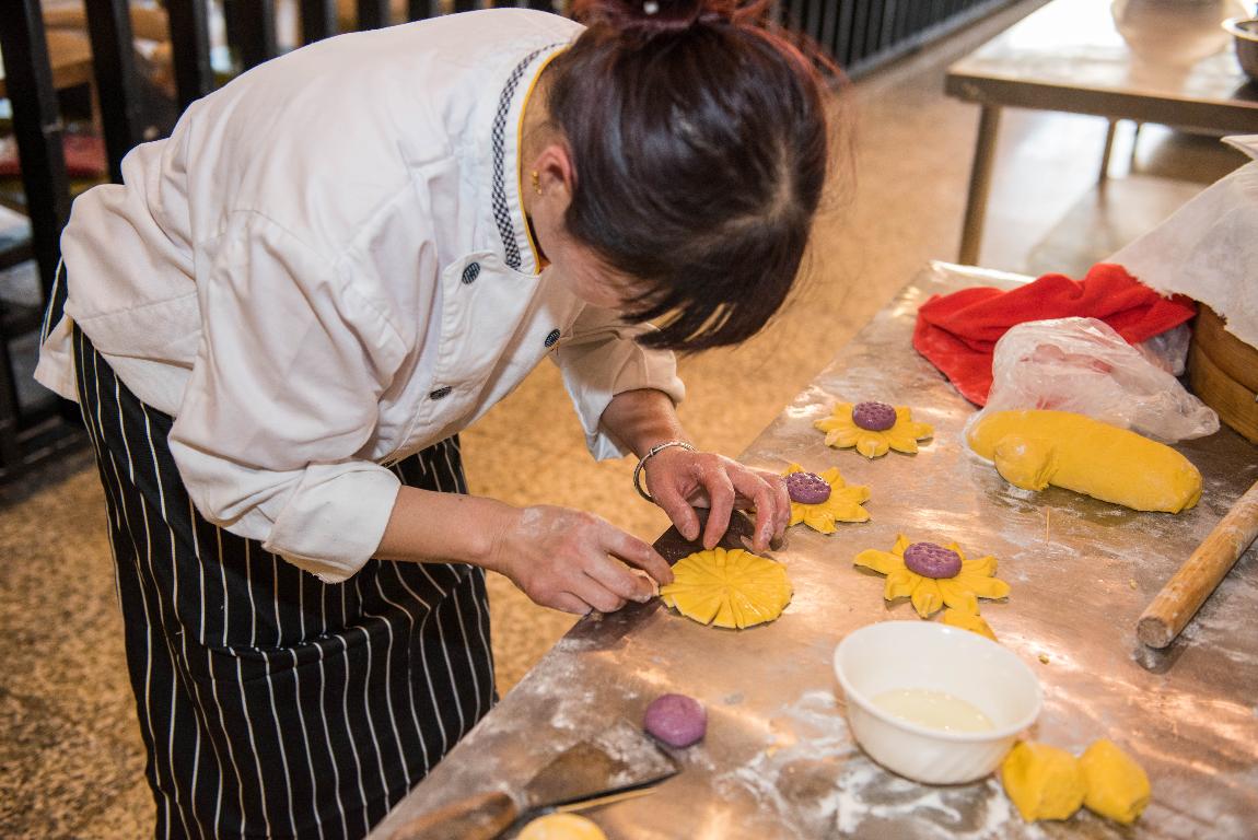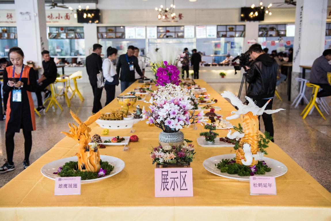 比赛过程中,各参赛队员们密切配合,忙而不乱地准备着自己的参赛作品,分工合作,切菜、摆盘、做造型,每个人都井然有序的开始自己的工作。娴熟的刀工、精湛的技艺,使得一份份普普通通的原料变成了一盘盘精细、色泽鲜亮的美味佳肴。整场比赛到处弥漫着诱人的香味,在场师生都迫不及待地想去品尝美味菜肴。红案的松鼠鱼、锦上前程、金桔仔排、香波鲜鱿、菊花鱼、雀巢拔丝,白案栩栩如生的象形南瓜、向日葵馒头、月牙蒸饺、小猪包,一盘盘花样菜式,五彩缤纷的味觉冲击,在舌尖上情意绵绵,体现着选手们创新的思维与非凡的技艺。