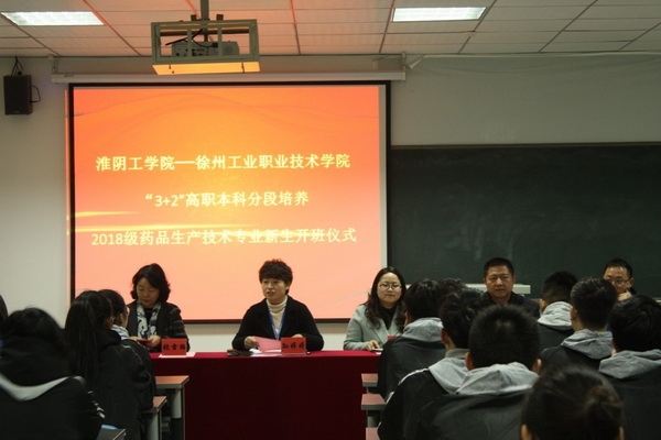 乘风远航启新程,春华秋实绘佳卷。11月23日上午,化工学院与淮阴工学院联合分段培养的“3+2”高职本科2018级药品生产技术专业新生开班仪式在B08-102隆重举行。我校化工学院、淮阴工学院相关负责人、教师及2018级新生参加了开班仪式,仪式由化工学院副院长孙婷婷主持。