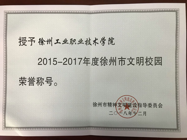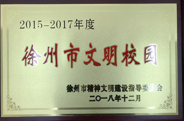 1月23日,徐州市精神文明建设指导委员会发布《关于表彰2015-2017年度徐州市文明单位、文明社区、文明村镇、文明校园的决定》(徐文明委〔2018〕8号),我校荣获“徐州市文明校园”荣誉称号。