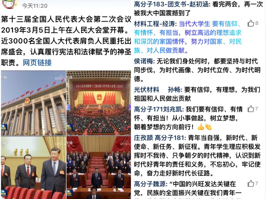 齐讨论,共话两会热点。3月6日,材料团总支开展“聚焦全国两会,牢记历史使命”的主题“线上线下”大讨论,通过观看“两会”视频同学们纷纷感叹国家发展之快,国家变化之大。在寄语“两会”QQ留言活动中,众多学子结合自身实际,针对与自身紧密相关热点问题畅谈感想体会。“两会”在青年学子中引发了热烈反响,他们纷纷表示 “无论我们身处何时,都要坚持与时代同步伐,为时代画像、为时代立传、为时代明德。”“总书记对人民的真切关怀,像春风般滋润着我的心田,犹如春天的风拥抱了我,撑起我梦想的帆!”