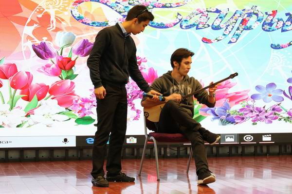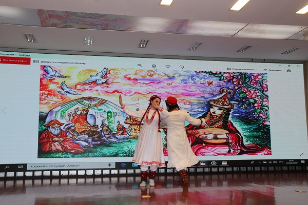 当天中午12时许,纳吾肉孜节庆祝活动在图书馆多功能厅拉开帷幕。在耀眼夺目的灯光下,中亚各民族同学们跳起了民族传统舞蹈,娴熟的“抖手、转手、晃手、弹指”技巧,配合以轻盈的舞步、柔软的身腰、优美的双臂、明快的节奏,展现了草原民族欢愉的生活场景和别样的儿女风情。悠扬的冬不拉回旋在会场,时而低回婉转,时而激越高亢。这音符如同精灵一般,配合着大屏幕的图景,在空中翩翩起舞,幻化出了一幅幅天色苍苍、四野茫茫、牛羊遍地、毡房排排的草原胜景。来自哈萨克斯坦的佳琪同学,充分展现了她的声音天赋。专业的混音技巧,飙高的海豚音效,将中亚民族歌曲表现的美轮美奂,真挚的感情,完美的声线,引来全场阵阵的掌声。