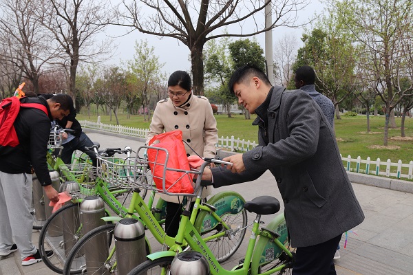 随后,孟醒老师布置了此次公共实践活动事宜,并对工作提出了具体要求。师生一行数十人拿着清洗工具,来到了玉潭湖公园校外公共自行车停放点,对自行车进行了仔细地擦洗。他们的行动感染了路过的群众,纷纷加入到志愿服务的行列中来,并和留学生拍照转发留念。活动中,同学们还向宿管阿姨、保安发放了劳保用品。