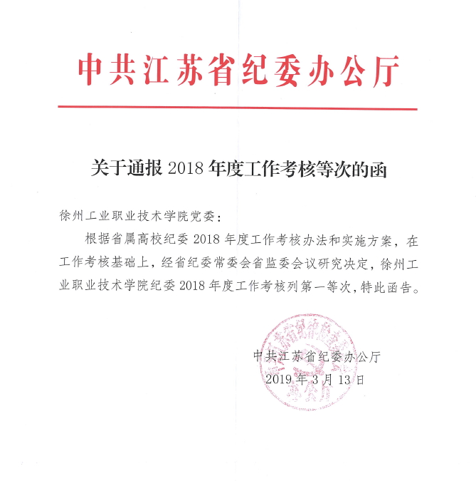 近日,中共江苏省纪委办公厅函告学院党委,徐州工业职业技术学院纪委在全省42家省属专科院校纪委2018年度工作考核中,位列第一等次。