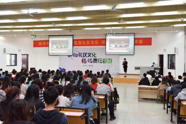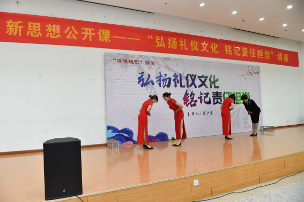 宣誓仪式结束以后,蔡少惠女士作了题为《弘扬礼仪文化,铭记责任担当》的主题讲座。她用生动的语言和事例使师生们更深入地了解弘扬中华礼仪的重要性和青年学生在其中的责任担当,了解了礼仪的规范表现形式和不同场合着装要求等。现场蔡少惠老师还与师生进行互动,现场教授了2节校园礼仪操,使师生们更加深刻地感受到了学习礼仪的重要性。