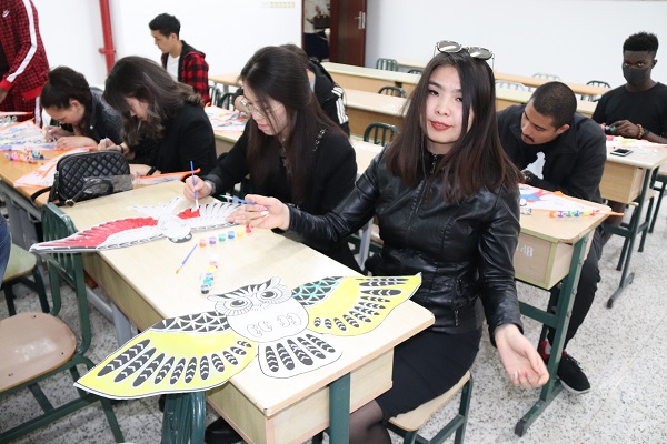 活动前,辅导员老师在教室向留学生讲述了风筝制作的历史、制作的工艺、绘色的技巧和放飞方法,并现场指导留学生亲手绘制传统纸鸢。学生在老师的指导下拿起毛笔,一笔一划地认真描绘,他们笔下描绘的动物形象活灵活现、惟妙惟肖。
