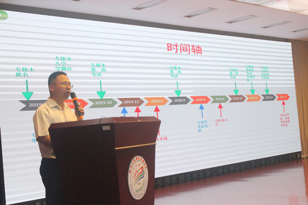 陈群玉副院长首先通过一些网上调研、大型企业招聘要求,说明学历到底有重要,并列举我校两名校友由专科到博士生的学习历程,鼓励大家要坚定自己的梦想。接着,陈群玉院长介绍了专科生升学的四种途径,就报名时间、考试的难易程度、文凭的认可度、学习形式、获取学历与学位的难易程度等相关信息进行对比,并通过一个时间轴详细对比了专转本和专接本两种方式的不同。