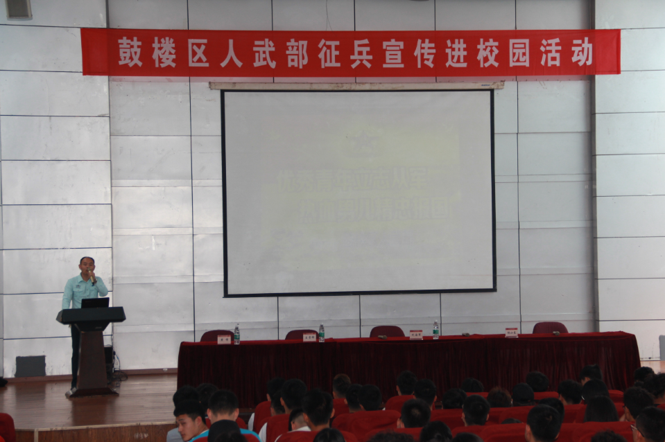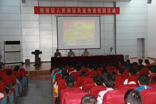 活动开始,鼓楼区人武部政委代海军以“优秀青年立志从军,热血男儿精忠报国”为题进行国防教育专题讲座。代政委就现役军人的发展前景作了详细介绍,并结合本人的成长经历鼓励学生积极响应祖国号召,投身国防,立志成才。