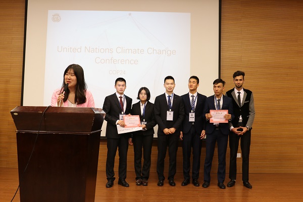 在正式的比赛中,我院选手表现出色。此次模拟联合国会议围绕“世界气候变化”议题展开讨论,分为朝韩高级官员代表团谈判、20国集团峰会、2019联合国气候变化大会等几个环节,选手们围绕自己会场的议题展开了激烈讨论,他们各抒己见,纷纷放眼世界,以广阔的全球视野提出自身的青年观点,通过精彩的发言与紧张的比拼,我校选手最终脱颖而出,其中乌兹别克斯坦籍留学生韩德、熊为获得“Outstanding Delegates”(优秀代表奖),宋页诗等作为优秀选手,获得“优秀辩手”称号。他们以流畅的语言表达、洞彻的时局认识,同来自中国矿业大学、徐州医科大学、江苏师范大学等本科学校的200余名中外选手展开角逐,就全球气候变化、半岛核问题、国际经济贸易壁垒、绿色能源与可持续发展等当今世界的重大问题进行探讨,通过文件撰写、主题演讲、分组讨论、投票表决等方式参与到“联合国与区域事务治理与讨论”当中,展现了较强的国际化战略视野和跨文化综合素质。
