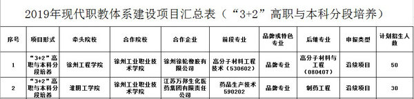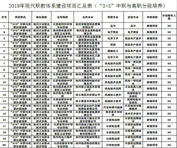 近日,从江苏省教育厅《省教育厅关于公布2019年江苏省现代职教体系建设试点项目的通知》(苏教职〔2019〕18号)文件获悉,我校2019年现代职教体系“3+3”试点项目共申报21项,获批20项,比2018年新增7项,比2017年新增12项,取得历史性突破。另外,申报的普通本科与高职院校分段培养“3+2”两个延续项目也全部获批。