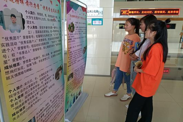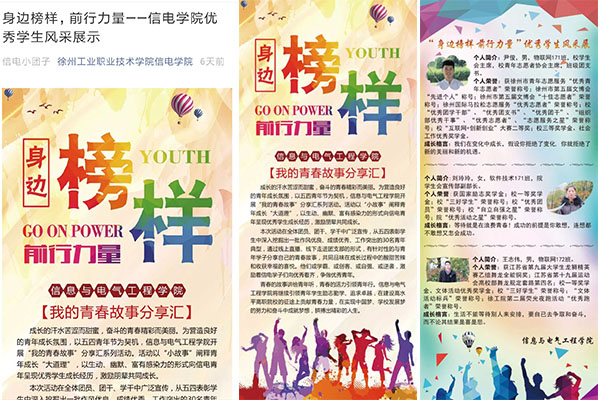 以五四表彰为契机,在全体团员、团干、学干中广泛宣传、深入挖掘出一批作风优良、成绩优秀、工作突出的青年典型,通过海报、微信平台进行展示。他们中有勇于担当,甘于奉献的班长、团支部书记、学生会干部;有刻苦勤奋,名列前茅的学习标兵;有努力超越,追求卓越的竞赛能手;也有艰苦奋斗,自强不息的命运搏击者等。他们不甘平凡,用奋斗的汗水浇灌梦想之花,用理想的明灯照亮前行之路。