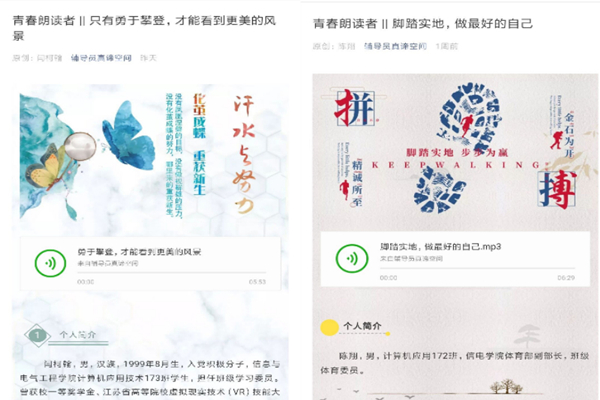 学院根据班级所需,在受表彰学生中挑选出30名特色鲜明、故事丰富的优秀青年,通过线上青春朗读者、线下走进班级团支部的形式,有针对性的与青年学子分享自己的青春故事,共同品味在成长过程中的酸甜苦辣和收获幸福的喜悦。参与分享的同学展现出坚忍不拔的意志,勇立潮头的信念,永不言弃的决心和砥砺奋进的执着深深的感染了班级同学。他们的故事激励着每一位信电青年为自己的青春梦想而负重前行,为自己的不悔人生而矢志奋斗。