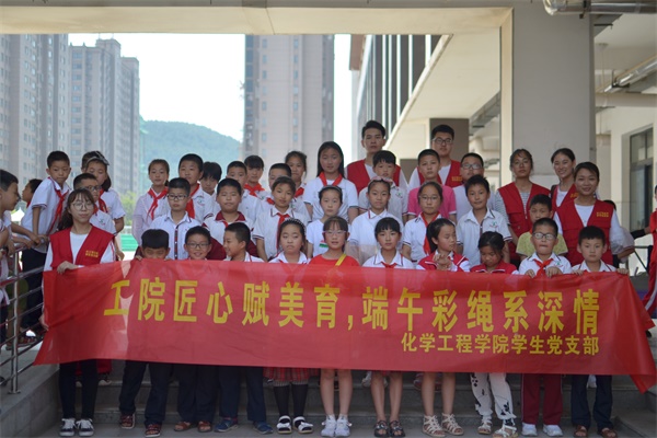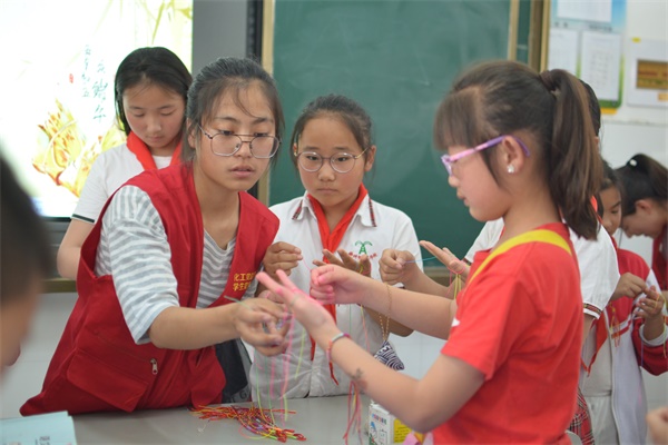 6月4日下午,化工学院组织大学生志愿者赴化工学院美育共建单位徐州市火花学校,为四年级一班40名学生带去了一堂有趣生动的中国传统文化课。课堂上,志愿者们向孩子们介绍了端午的由来及古代端午风俗,在屈原故事中领略爱国情怀,在声声《离骚》吟诵中体会端午这个“诗人的节日”,为孩子们印下传统文化基因。为了加强孩子们对传统文化的体验认识,志愿者们带领孩子们编织端午“五色绳结”,感悟丝线缠绕下的美,并向孩子们赠送了端午香囊。一个下午的相处使孩子们和志愿者建立起深厚的友谊,为日后进一步的美育共建打下了良好的基础。