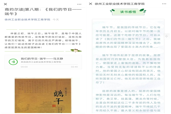 工商管理学院在官方微信公众平台的“商约尔读”荐书专栏中,开展了端午节主题荐书阅读活动。经过两周的线下试读,学院精选了经典书目《我们的节日·端午》,推荐给广大同学阅读。本书通过介绍端午节的历史、风俗、饮食、传说等知识,引导读者学习传统文化,传承中华文明,发扬民族精神,表达爱国情怀。试读的同学们撰写了读书感悟,纷纷表示通过阅读,收获很大。