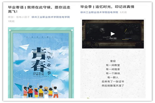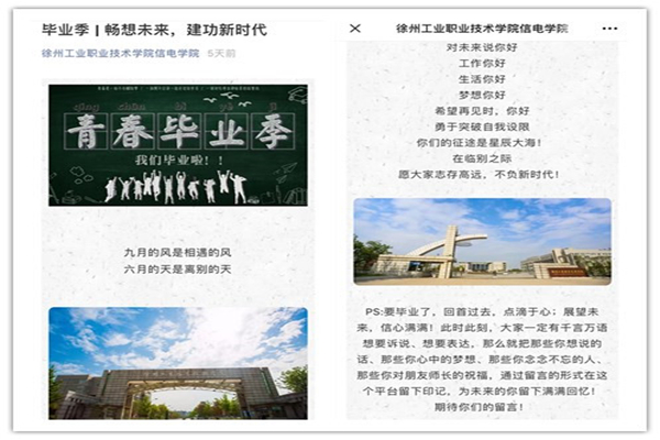 为在学生返校前营造氛围,学院微信公众号推出“祝福深深·铭记信电情”、“追忆时光·印记述真情”、“畅想未来·建功新时代”系列活动。学院领导和班主任们深情撰写寄语,为毕业生送上最真挚的祝福,期望他们可以在未来宏图大展,实现自己的人生理想;暖心视频“我们那些年一起走过”追忆三年工院生活的点滴,定格大学生活最精彩的时光,通过一首“同桌的你”背景音乐,述说彼此的依恋与不舍;回首过去,感恩于心,畅想未来,信心满满,毕业生纷纷在“畅想未来留言板”平台上诉说对母校的恋恋不舍、对老师的深深祝福、对未来的人生期许。