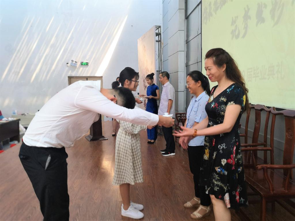 敬师献茶活动,在豪迈高亢的《大风歌》朗诵中来开序幕,雄浑的诵读声让在场所有人豪气顿生,心生守护四方的责任。 在敬师茶环节,毕业生代表依次上台,举杯齐眉、躬身献茶,向老师献上浓浓的敬意。伴随着悠扬婉转的古筝声,活动愈显温馨而隆重,台上师生真情相拥、台下热烈掌声雷动,仪式感加强了学生对于陪伴自己3年老师的尊敬之情。老师们为毕业生颁发证书,表达了毕业的祝贺,希望毕业生要牢记责任和使命,锻造真才实学,练就过硬本领,注塑自身品格。