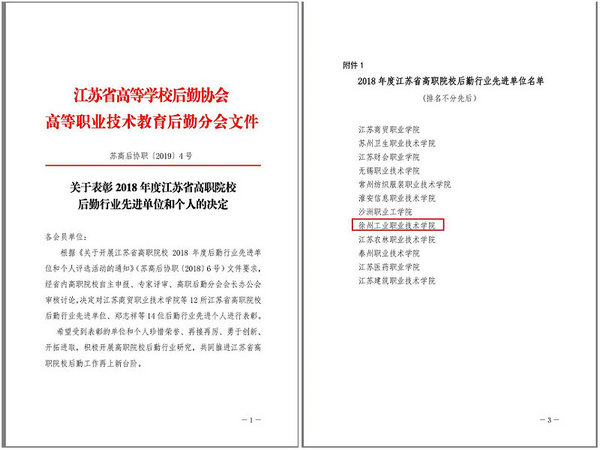 近日,江苏省高等学校后勤协会高等职业技术教育后勤分会发文表彰了“2018年度后勤行业先进单位和个人”。我校荣获“2018年度高职院校后勤行业先进单位”称号,全省共12所高职院校获此殊荣。这是继我校荣获《2015-2018年度江苏省高等学校后勤行业先进集体》后的又一项殊荣,是对我校后勤工作的充分肯定。
