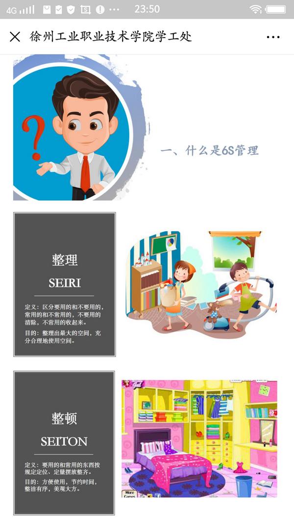 6S管理是针对经营现场和工作现场开展的一项现场管理活动,其活动内容为“整理(SEIRI)、整顿(SEITON)、清扫(SEISO)、清洁(SEIKETSU)、素养(SHITSUKE)、安全(SECURITY)”,最初应用于企业现场管理。将6S管理法引入到学校的宿舍管理中,可营造安全、整洁的公寓环境,提升工作人员和学生的文明素养。该标准推行初期,学工处副处长安莹为公寓管理中心及物业公司工作人员开展了6S管理的相关知识培训;中期成立以区域主管为主的学生宿舍6S管理工作小组,经过多次研讨和实践,制定了《徐州工业职业技术学院6s宿舍管理规范》及《物业公司6S管理考核标准》,形成了“ 一美、二齐、三无、四有、五净、六做到、七禁止” 宿舍6S管理文明公约,并将6S标准融入星级宿舍和文明宿舍评比中,修订了《徐州工业职业技术学院文明宿舍评选办法》,形成了一系列规范化、标准化的管理制度;之后通过线上线下多种途径广泛宣传,多次组织员工学习,并在本学期的文明宿舍检查中开始执行。经过一年多的建设和实践,学生宿舍星级比率达66%,同比增长13个百分点;宿舍卫生检查合格率为99%,同比增长8个百分点;宿舍安全隐患减少11个百分点,文明宿舍比例同比增长2个百分点,管理成效显著。