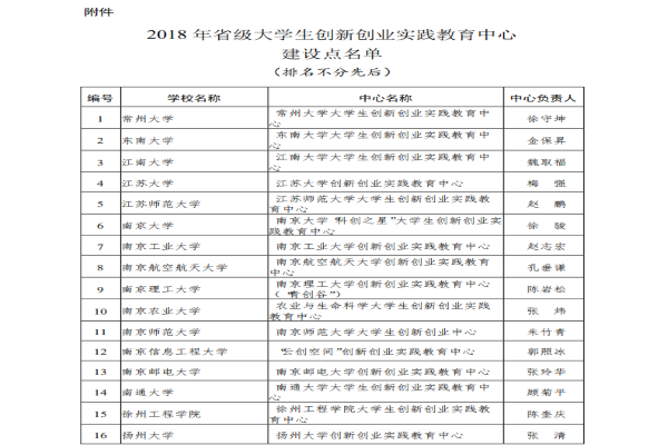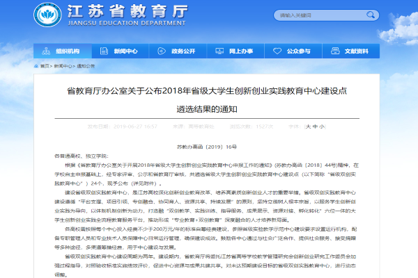 6月21日,江苏省教育厅下发了《省教育厅办公室关于公布2018 年省级大学生创新创业实践教育中心建设点遴选结果的通知》(苏教办高函【2019】16号)。经学校申报、省教育厅审核,我校申报的“智能制造创新创业人才实践教育中心”获批成为省级大学生创新创业实践教育中心,成为首批立项的24所高校之一。