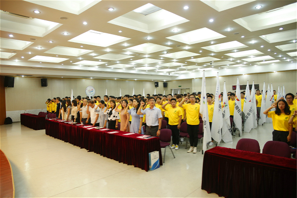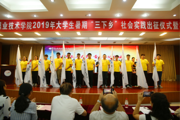 仪式现场,与会领导为25支实践团队授旗。全体师生在实践团成员代表徐云鹏同学的带领下庄严宣誓,立志以最饱满的热情和最高昂的斗志,保质保量完成各项实践任务。