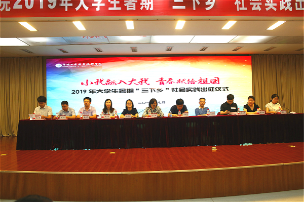 7月5日下午,我校“小我融入大我 青春献给祖国”2019年暑期社会实践出征仪式暨培训会在图书馆报告厅隆重举行。党委副书记李红、党委委员、党委宣传部部长乔向东、团委书记张妍妍、工会副主席刘立新、学工处副处长安莹、各院学生工作分管副院长、团委全体人员、团总支书记、各实践团队指导教师及队员参加了出征仪式。仪式由团委副书记庞世华主持。