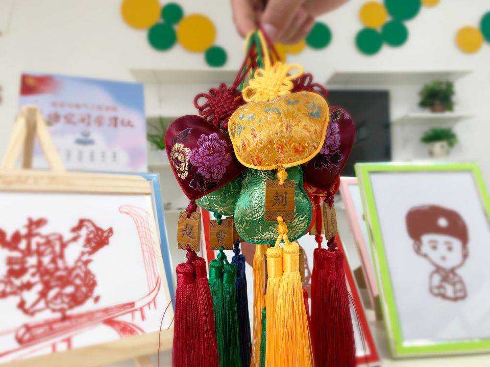实践团成员分工明确,通力合作,精心制出形状各异的50个创意香包,并根据香包的大小与形状,设计、制作出不同形状和材质的腰牌。每个腰牌上精心雕刻打磨出不同的姓氏,以满足顾客多样化的需求。为了将香包和腰牌进行完美搭配,实践团成员专程来到徐州香包传承人丁老师工作室,在丁老师的指导下,同学们将不同形状的香包和腰牌进行编结,让整个非遗作品在色彩与搭配上更加协调美观。