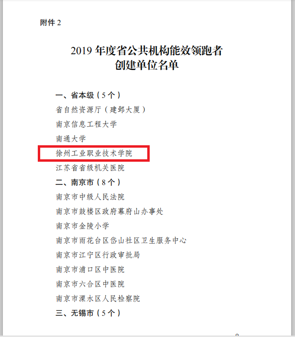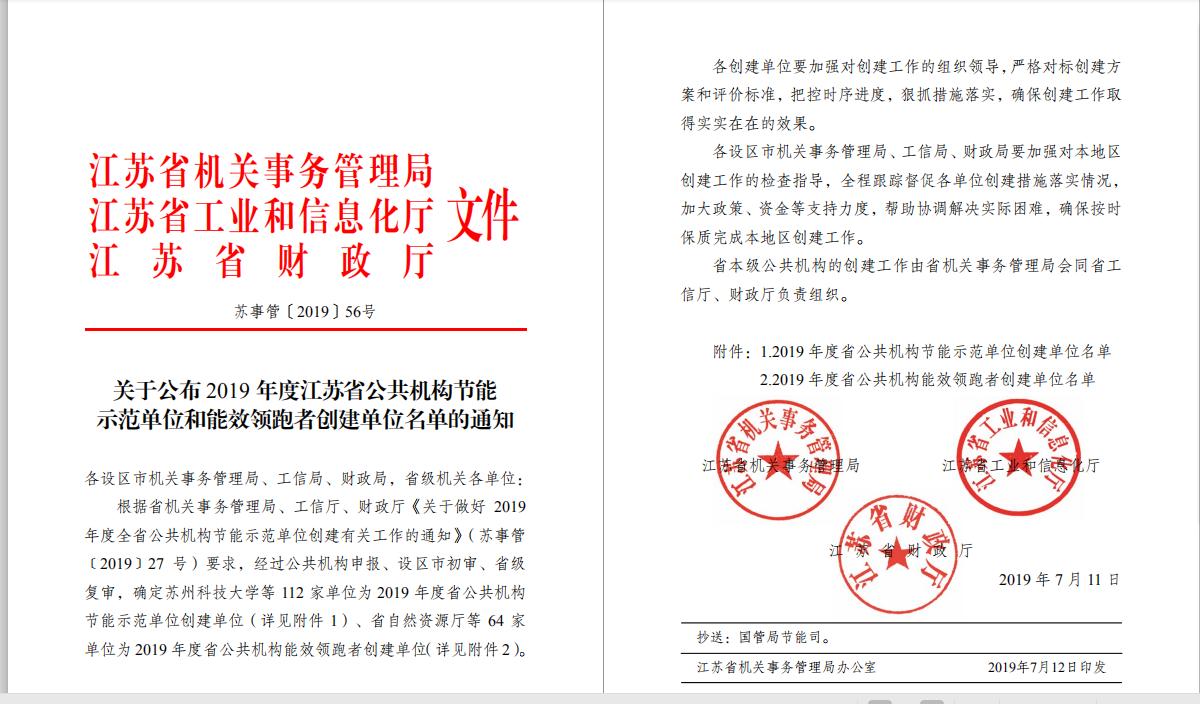 2019年7月16日,江苏省机关事务管理局、江苏省工业和信息化厅、江苏省财政厅联合发布了《关于公布2019年度江苏省公共机构节能示范单位和能效领跑者创建名单的通知》(苏事管〔2019〕56号)。我校成为本次入选的3所省属高校中唯一的高职院校,也是自江苏省2018年启动第一批公共机构能效领跑者评选以来第四所入选的高职院校,是我校获得的省级节能工作最高荣誉。