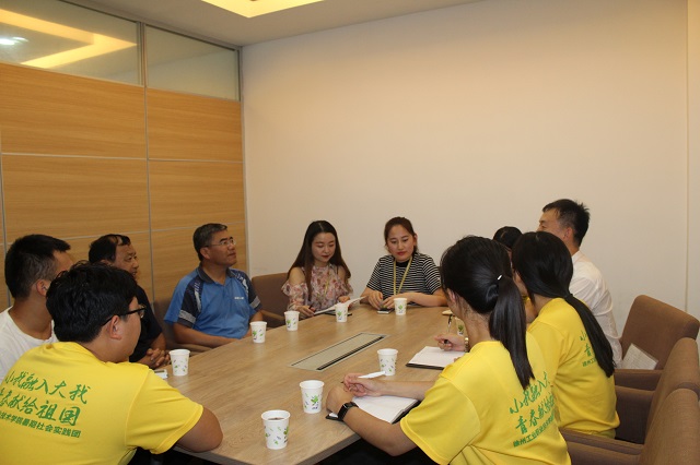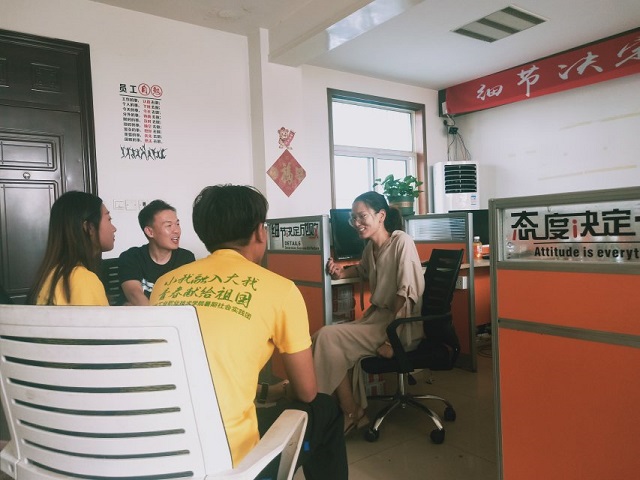 7月14日,实践团成员经过3个小时的奔波到达了连云港市东海县安峰镇上的锋转园林有限公司,12级校友佟会芳热情接待了实践团一行。佟会芳现任锋转园林有限公司的副总经理,分管人事与后勤保障工作。佟会芳讲述自己先就业再创业的经历,回答了团员自己未来在就业创业的路上应注意的问题。当团员问到佟会芳对在校大学生有什么寄语时,佟会芳说到:“如果条件允许的话,能转本、接本肯定是要读的,本科生和专科生站的高度、考虑问题的角度是不同的;一定要注重社会实践的参与,这对以后步入社会有很大帮助。”她认为专科学习的知识相比较而言还是有些浅薄,只有不断深入地学习才能有更大的发展空间。她在接受采访的过程中着重强调了社会实践的重要性,“过去我在大学期间就是负责社会实践工作的,从社会实践中我着实发展了很多能力,这些能力可以说在我现在的工作里都发挥着无可替代的作用。”团员们纷纷点头表示赞同。