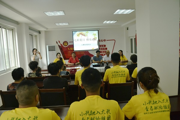 7月9日,在徐州市泉山区苏山街道玉潭佳苑社区的会议室里,实践团和10多名留守儿童和爷爷奶奶,围绕“七彩夏日快乐成长”为中心开展主题活动,团总支书记黄媛媛老师介绍了“心手相牵阳光同行”关爱特殊儿童彩虹行动相关活动内容,并强调后期将以传播社会主义核心价值观、弘扬中华优秀传统文化为理念,和社区深入交流,传播向上的正能量。郑禹彤老师开展了以“你的健康我来守护”为主题的食品安全知识讲座,通过通俗易懂的讲解和有趣的问答互动等方式讲授食品安全和健康饮食知识,引导留守儿童形成科学、安全、合理的饮食卫生习惯,让留守儿童身心健康得到快乐成长。随后,实践团成员和留守儿童进行拼图等互动游戏和感恩教育、素质拓展等系列活动,用爱心和真情陪伴他们度过了难忘的时光。