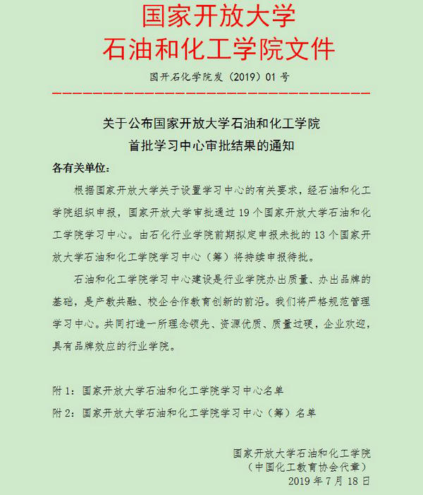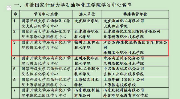日前,国家开放大学石油和化工学院公布了首批学习中心审批结果(国开石化学院【2019】01号文),首批全国共有19个学习中心通过审批,江苏仅有3个学习中心入选。徐州工业学习中心是唯一一个通过审批的以高职院校为主体,与企业共建共管的学习中心,可以开展开放教育化工类本、专科招生。