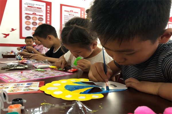 为了让孩子们走近历史,从优秀传统文化中汲取美育的力量,在培养“文化自信”的同时牢筑发自内心产生民族认同感,本次美育支教以红色为底色,以中华优秀传统文化为主要内容,带领孩子们一起制作简易皮影,绘制脸谱,唱戏曲,画五星红旗,讲老区革命故事,唱红色歌曲,做趣味游戏等,实践团成员还根据孩子们的年龄阶段,设计了不同的难易的教学内容。对于比较小的孩子们,形象生动的彩塑泥简单易上手。志愿者们准备了彩塑泥和传统皮影形象的画板,带领孩子们按照图案生动的将图片立体化,最终制成了一个个可爱卡通而又富含传统文化风情的皮影作品。稍大点的孩子在志愿者们的带领下,在仔细观看了哥哥姐姐们对楷书、隶书、行书等的字体特点及演变历程的演示讲解后,拿起毛笔,在纸上一笔一划的练习起来。工笔画是传统书画的掌上明珠,孩子们欣赏了志愿者的工笔画宫扇作品后纷纷跃跃欲试,在志愿者们手把手地教学中,孩子们深刻体验了钩、涂、浸、染等手法下的精益求精,并也完成了属于自己的作品。中国是礼仪之邦,尊老爱幼更是千百年流传下来的美德,在志愿者们的帮助下,孩子们穿上汉服,跟随志愿者们学习传统礼仪的一招一式,并从简单的礼仪动作中感悟中华礼仪之魅力。