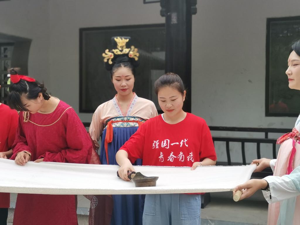 中国古典服饰文化给人美得享受和精神的滋养,独具韵味的传统服饰给予当代青年民族自豪感。“小青葱”暑期社会实践团志愿者们与江苏模特艺术学校学生,在云龙书院为市民朋友们献上“捣练图”的。志愿者们向往来市民娓娓道来古代服饰文化的精华,流畅生动的讲解,丰富的服饰展示,引得往来行人驻足观看。“材子材女”身着汉服、身临画中,像唐代的古人们一样捣练、织线、熨烫,身着汉服、体验捣练。在“汉服热”流行当下,让同学们亲身体会到汉服所代表的不仅仅只是中国传统的衣冠文化,更包含着中国古代劳动人民的智慧与辛劳。