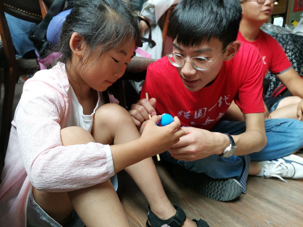“小青葱”暑期社会实践团队,来到徐州市云龙区黄山街道,为当地留守儿童们开启了一次传统民俗艺术的启蒙之旅,用赤子之心与青春活力打通关爱服务留守儿童的最后一公里。志愿者们与小朋友们一起亲手制作面泥,一块块面泥塑出童心梦想,一次次交流打开心灵之窗。“这个蓝胖子怎么捏一个尾巴呢?”小朋友稚气的问道。领队李安明笑着说:“你看小哥哥给你变一个,你看。”说着便从指尖搓出来蓝白相间的小球,逗的孩子们哈哈大笑。从一开始的害羞怕生,到后来与志愿者的依依不舍,志愿者们与孩子们交流民俗技、拓展视野的同时,也为孩子的成长架起了乐观开朗的心灵之桥。