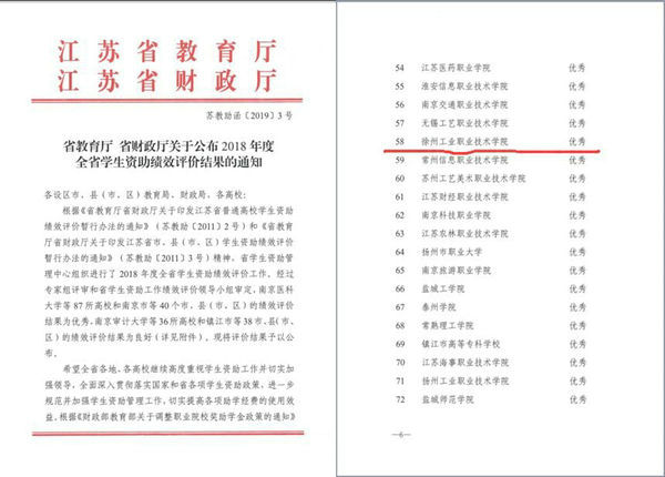 近日,江苏省教育厅、江苏省财政厅联合下发了《关于公布2018年度全省学生资助工作绩效评价结果的通知》(苏教助〔2019〕3号),我校荣获“2018年度江苏省学生资助绩效评价优秀单位”。这是我校连续第二年荣获“优秀”殊荣。这是上级教育主管部门对我校学生资助管理工作的充分肯定。