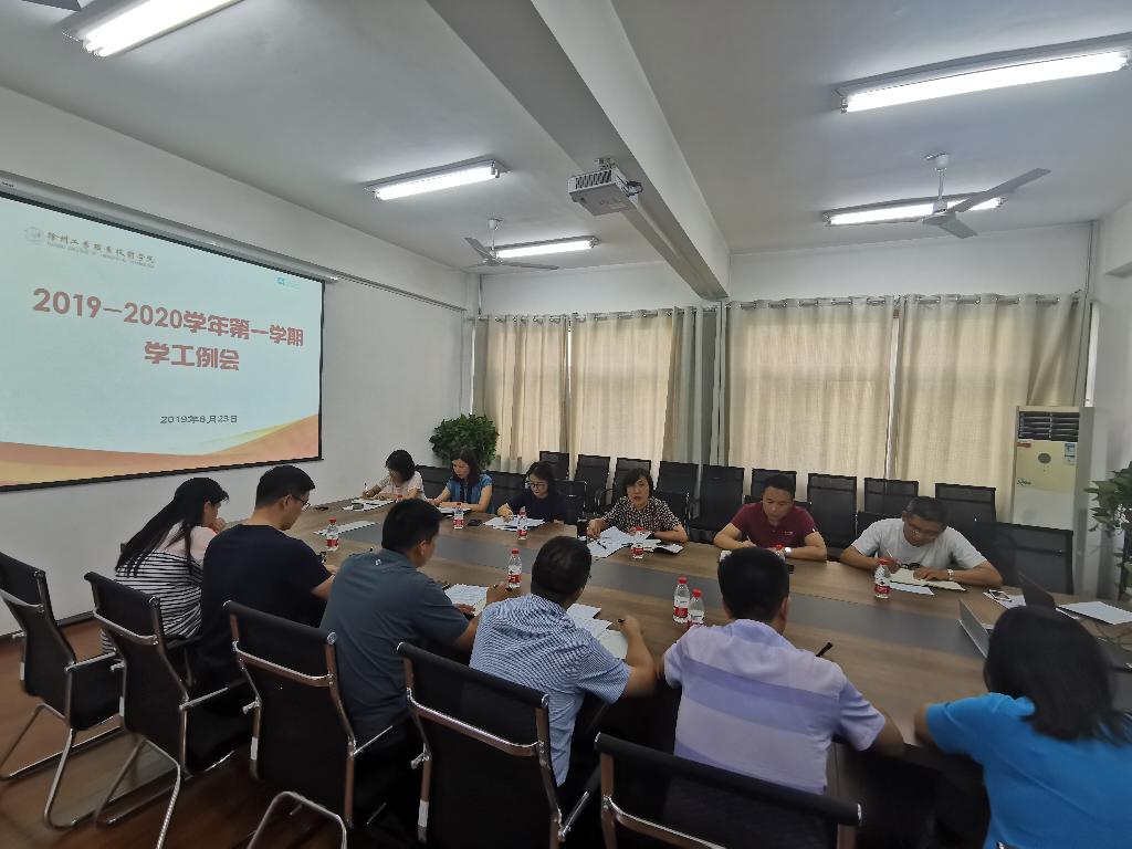 8月23日下午,我校在行政楼三楼会议室召开学期初学生工作会议,全面部署学期初学生工作。李红副书记,学工处、团委负责人及各二级学院分管学生工作副书记参加了会议。会议对老生返校报到、缴费注册、开学第一次班会课和第一堂课、学生安全教育管理等方面工作,以及2019级新生的宿舍安排、班主任聘任及新生提前报到、联系新生等工作,进行了详细的部署和安排。会议要求各学院及时召开新学期学管工作会议、班主任工作会议、学生干部会议,将开学初各项工作部署传达给广大师生,确保新学期学生工作平稳有序开展。