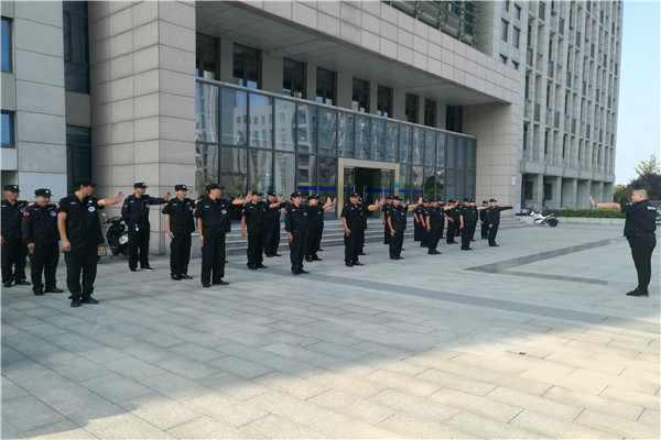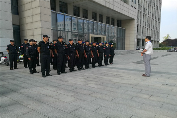 会后,保安公司组织全体保安员进行队列队形、车辆引导手势、规范用语等培训,要求每位保安员必须熟练掌握。