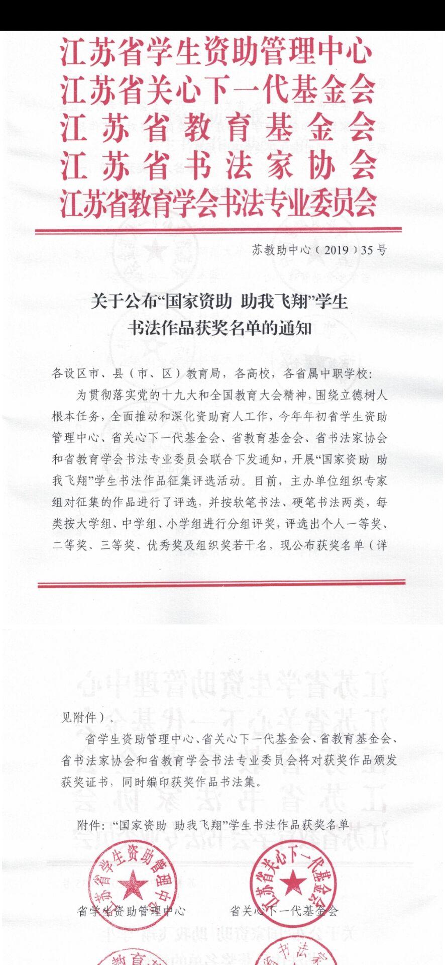 近年来,我校一直高度重视学生资助工作,连续获得2017、2018年度“江苏省学生资助绩效评价优秀单位”,2019年度江苏省“国家资助 助我飞翔”学生资助成效微电影创作大赛一等奖。此次学生资助书法作品获奖是对我校学生资助工作的再一次鼓励和肯定,我校将继续开拓创新,锐意进取,珍惜荣誉,开创资助育人新局面。