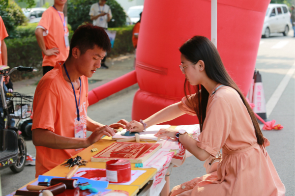 据悉,适逢新中国成立70周年和我校建校55周年,校团委协同校学生会制作了一批顺应当今网络流行、新生喜闻乐见的互动牌、横幅,并特别设计、制作了一批以校园美景为主要内容的拓印工具,在校学生会迎新服务岗供新生体验,让新生在报到过程中也能收获乐趣,增强新生的爱校荣校情怀。