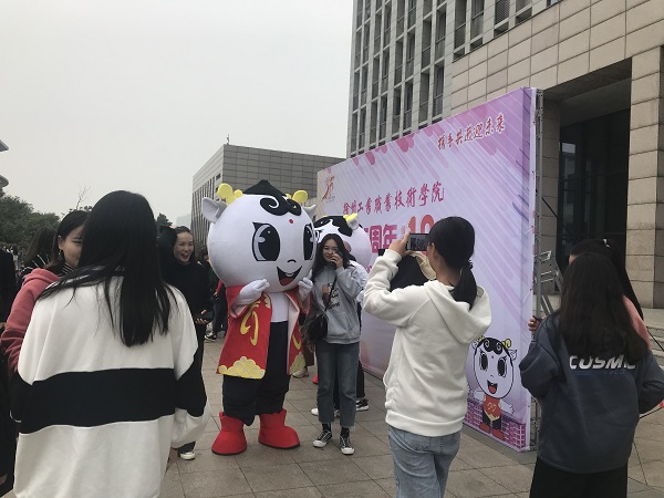 活动在激昂的校歌声中拉开帷幕,现场气氛热烈,同学们兴奋地与吉祥物人偶合影,在朋友圈、抖音等网络社交平台上为学校送上真挚的祝福,参与抽奖赢取校庆纪念品。