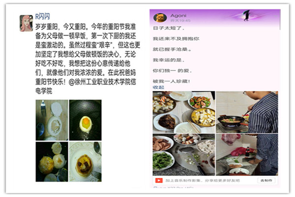 离校回家的同学们积极行动起来,为父母做了一件贴心实事。为父母洗一次脚、捶一次背、梳一次头、做一顿饭;陪父母近郊登高秋游、逛一次花鸟市场、做一次贴心长谈等等,陪伴父母度过快乐的一天,让父母切实感受到晚辈的孝心和敬意。昵称“笑迎今朝”在朋友圈中写到:“小时候觉得三年五年有一辈子那么长,世界任我们去丈量、去闯荡。今天在给妈妈梳头时看到了几缕白发,才发现八年十年好像是指缝间的事。时间就在我们的指缝中,把父母从中年人催成了老年人,感恩报恩不能等待”。