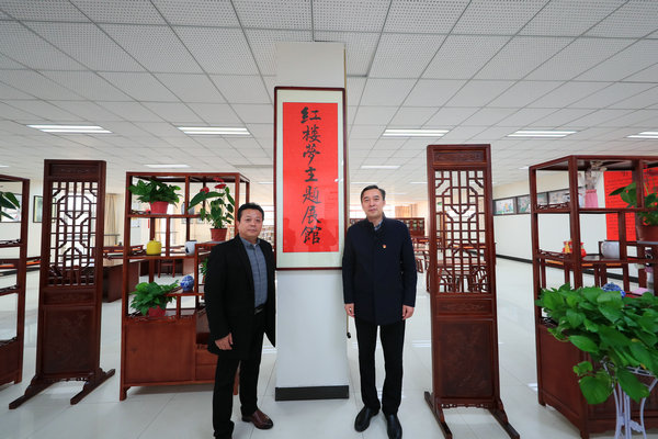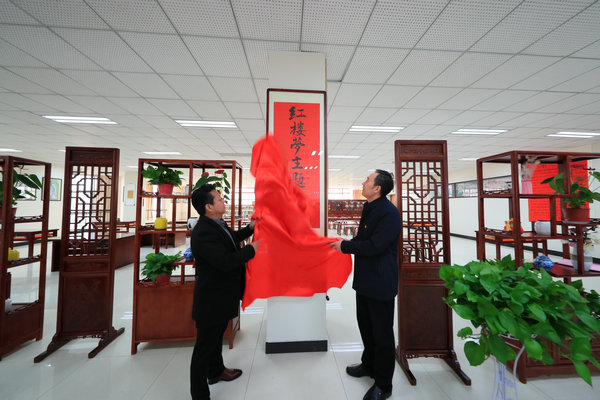 11月22日下午,我校在图书馆四楼红楼梦主题展馆举行红楼梦主题展馆落成暨揭牌仪式,党委书记祝木伟,党委副书记李红,副院长朱作付,江苏乾景检验有限公司总经理、山东德州双泰置业有限公司董事长兼总经理王宗乾出席揭牌仪式,党委宣传部、党委教师工作部、图文中心负责人及相关工作人员参加了揭牌仪式。党委书记祝木伟、王宗乾董事长共同为“红楼梦专题展馆”揭牌。揭牌仪式由慕东周主任主持。
