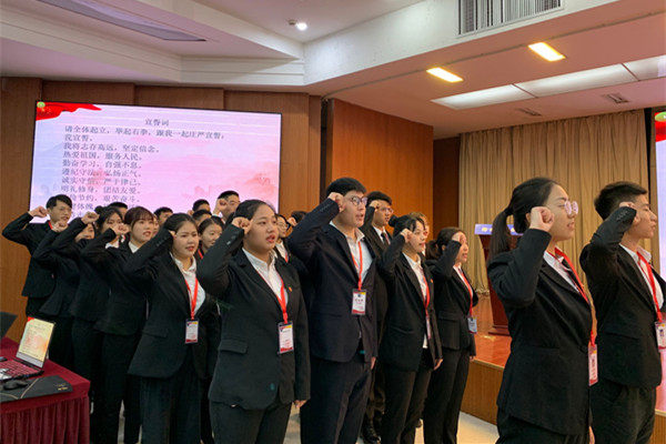 团委书记张妍妍郑重的为工商管理学院第五届团学联授旗。副院长秦黎明宣读工商管理学院第五届团学联学生干部名单。第五届学生会主席熊玲宣读了本年度学生会工作计划报告,副主席权瑜代领全体学生干部带领全体参会学生宣誓,一句句发自肺腑的铿锵誓词表达着他们为学生服务的坚定信心。