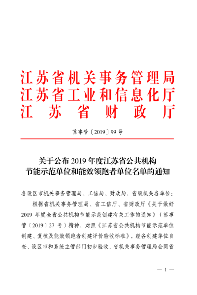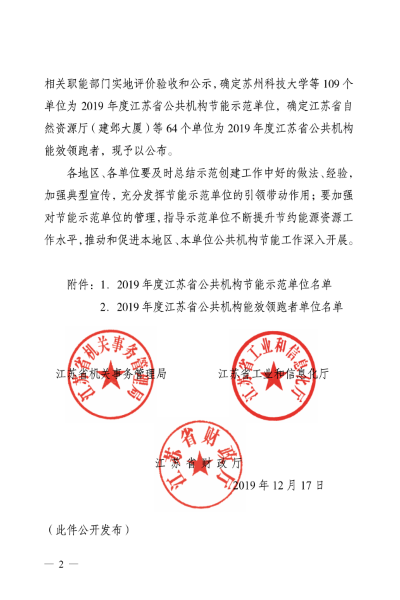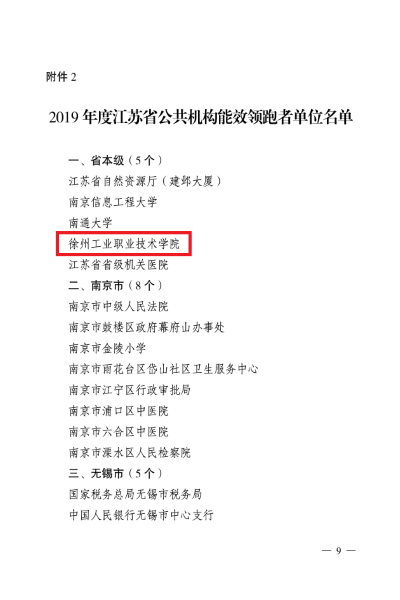 12月17日,江苏省机关事务管理局、江苏省工业和信息化厅、江苏省财政厅公布了2019年度江苏省公共机构能效领跑者单位名单。我校作为本年度入选的省本级3所高校中唯一的高职院校获此殊荣,是我校获得的省级节能工作最高荣誉。