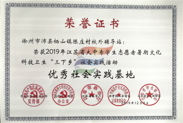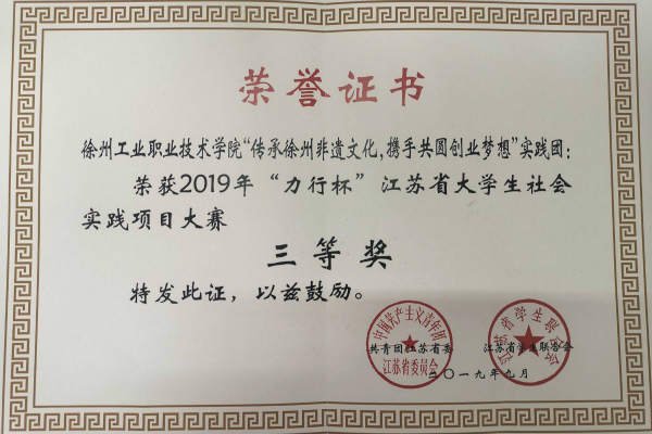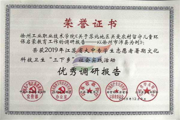 在此次全省评比中,我校团委荣获省“先进单位”;翁远老师荣获省“先进工作者”;尹俊、潘嘉敏两位同学荣获省“先进个人”;“边远不边缘,美育润心田”暑期社会实践团荣获省“优秀团队”;徐州市沛县栖山镇陈庄村校外辅导站荣获省“优秀社会实践基地”;《关于苏北地区关爱农村留守儿童环保启蒙教育工作的调研报告——以徐州市沛县为例》荣获省“优秀调研报告”。此外,我校“传承徐州非遗文化,携手共圆创业梦想”暑期社会实践团荣获2019年“力行杯”江苏省大学生社会实践项目大赛三等奖。