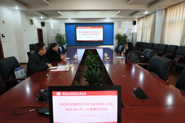 12月27日,越南STEPS语言中心总裁Anh Bach女士来访我校,我校院长张登宏热情接待了客人,双方就建立我校越南留学生招生基地进行了友好洽谈,外事办副主任王建华参与了会谈。