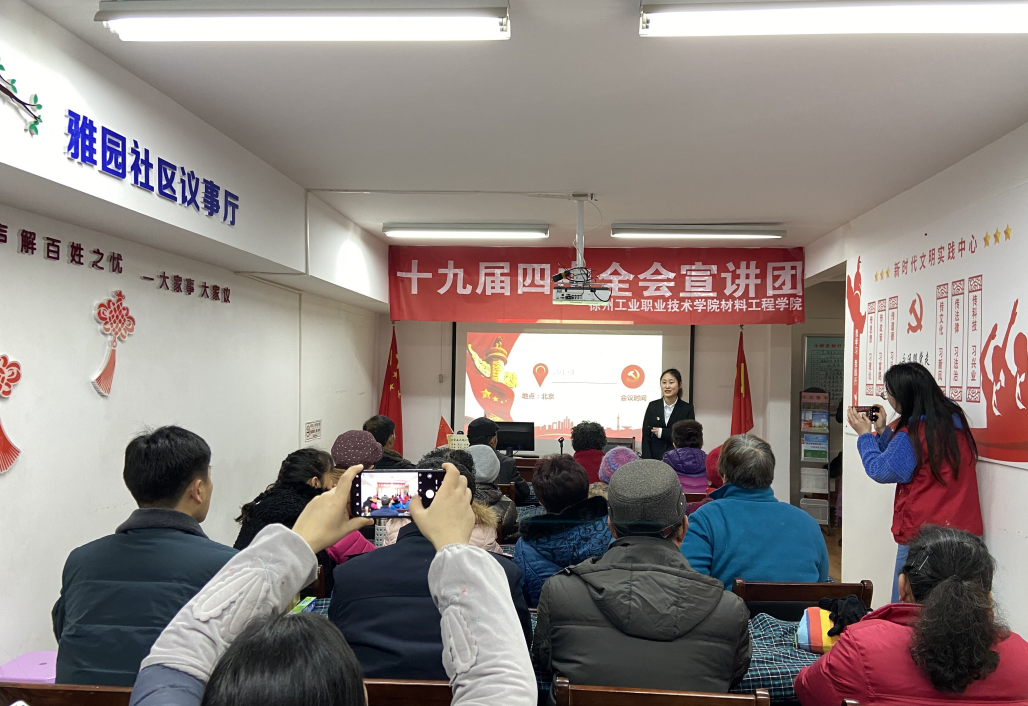 为了更好的贯彻高校与社区党建共建,使学生党员能够强化责任担当,走出校园、回报社会,充分发挥大学生党员先锋模范作用,材料工程学院学生党支部组建成立了12人的“党的声音进万家”党的十九届四中全会青年志愿者宣讲团,深入基层一线为社区居民宣讲党的十九届四中全会精神。