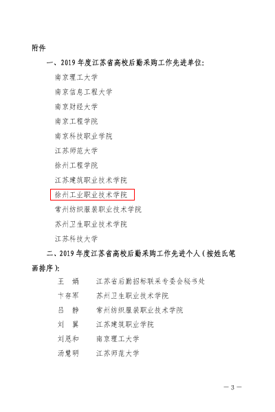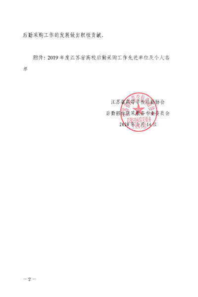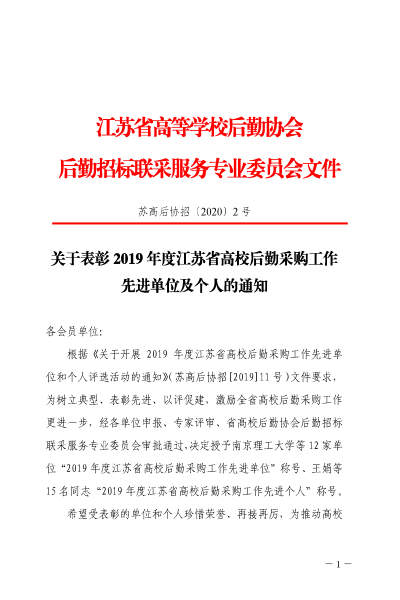 近日,江苏省高等学校后勤协会后勤招标联采服务专业委员会开展了“2019年度后勤采购工作先进单位和个人”评选活动,旨在表彰在后勤采购工作中表现突出的单位及个人。我校国有资产管理与后勤服务中心在此次活动中认真筹划、精心准备,最终荣获“2019年度江苏省高校采购工作先进单位”称号。这是对我校后勤采购工作的充分肯定。