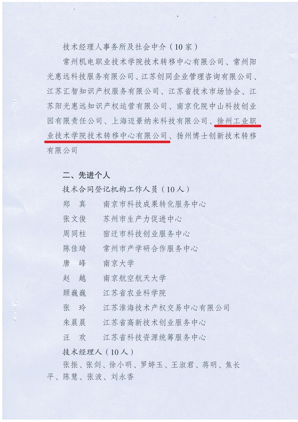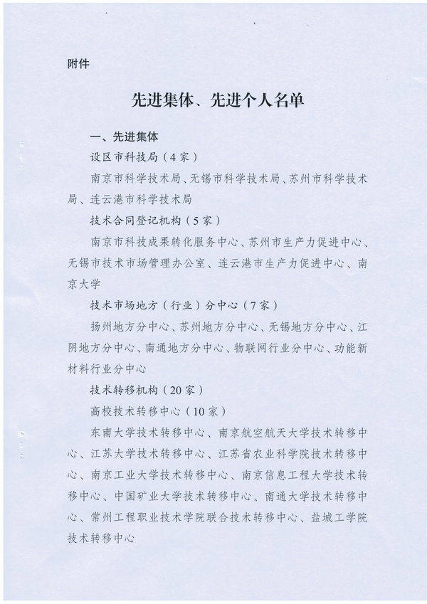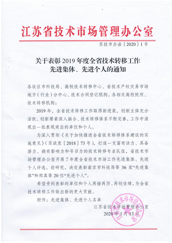1月15日,2019年度江苏省技术转移工作会议在南京举行。大会对全省技术市场工作及技术合同登记情况进行了总结和表彰,我校技术转移中心有限公司被评为“2019年度江苏省技术市场先进集体”。